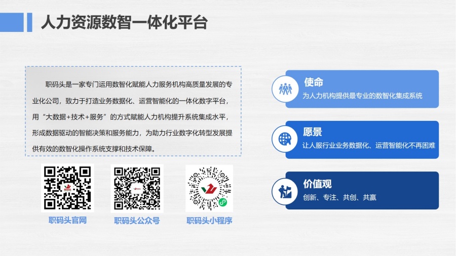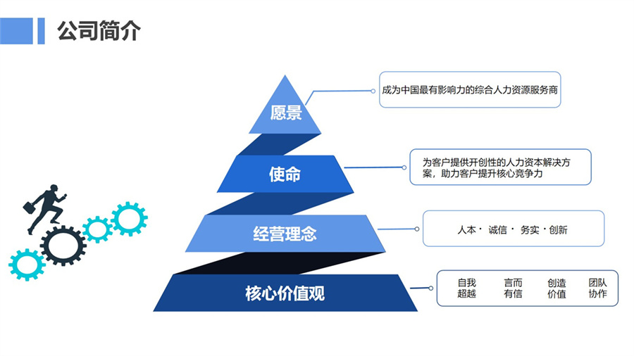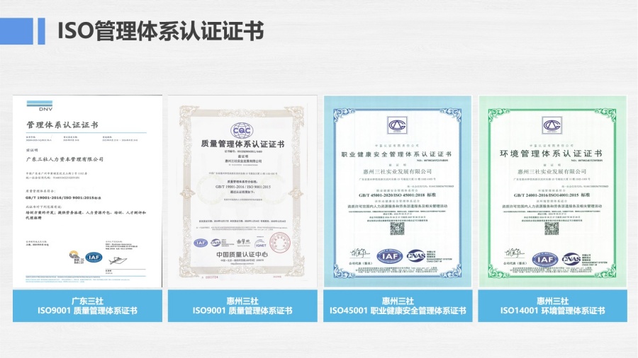 公司成立20年来,始终坚持以“为客户提供更加丰富、创新的人力资本解决方案,助力客户提升核心竞争力”为使命,以“人本、诚信、务实、创新”的经营理念服务于广大客户,公司获得ISO9001质量管理体系、ISO45001 职业健康安全管理体系、ISO14001 环境管理体系和ISO27001信息安全管理体系认证。