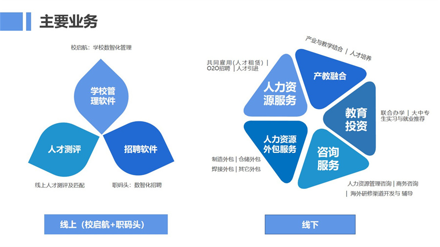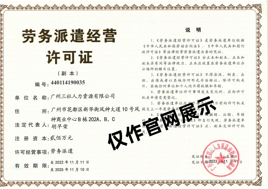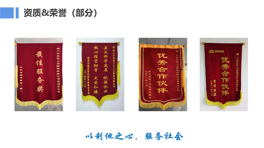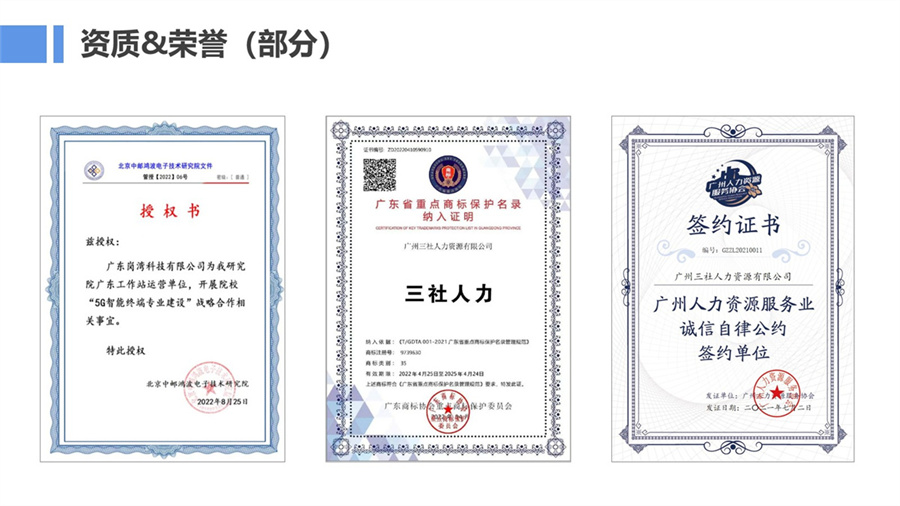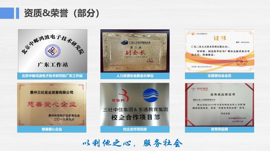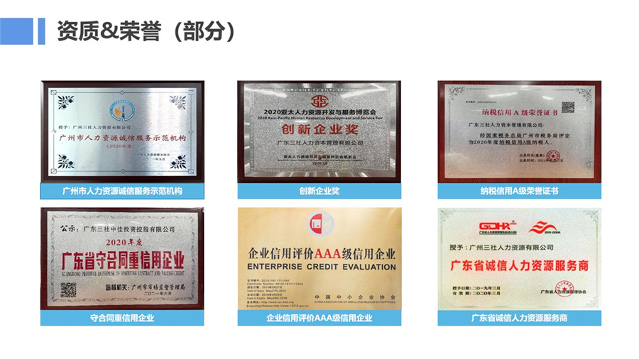 目前,公司已实现线上+线下的服务网络,并覆盖全国各大中城市,业务领域涉足制造、物流、互联网、金融、电子信息、智能、零售、快消品、教育科技、供应链等产业。同时,在政府和广大客户的厚爱和支持下,获得了“广东省重点商标保护名录”“人力资源服务机构能力指数5A等级”、“首批人力资源服务机构诚信5A等级”、“惠州市首届劳务派遣服务五星级单位”等荣誉,为成为中国最有影响力的综合人力资源服务商迈出了重要一步。
