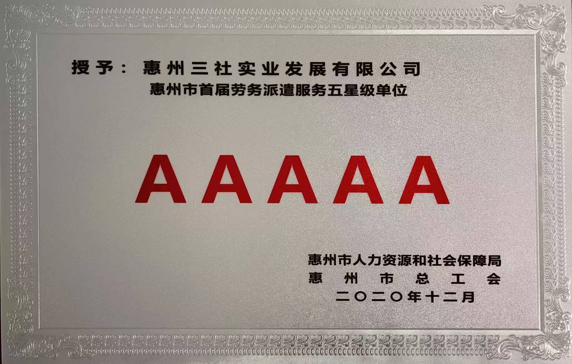 惠州市首届劳务派遣服务五星级单位