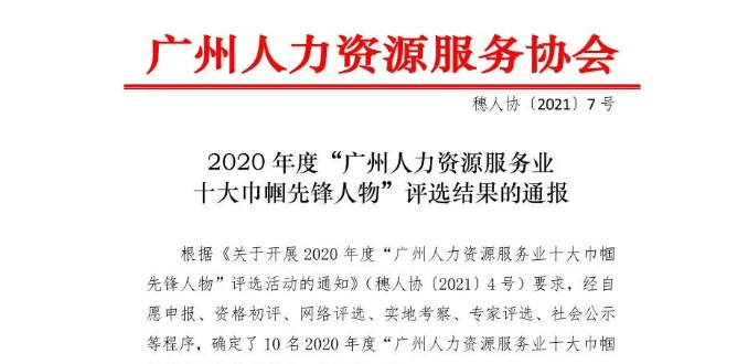 为展示新时代女性自强不息的精神风貌 2020年度广州人力资源服务业十大巾帼先锋人物 经过自愿申报、资格初评、网络评选、实地考察、专家评选等环节 日前,确定了10名2020年度“广州人力资源服务十大巾帼先锋人物” 其中,三社人力董事长胡早荣女士...