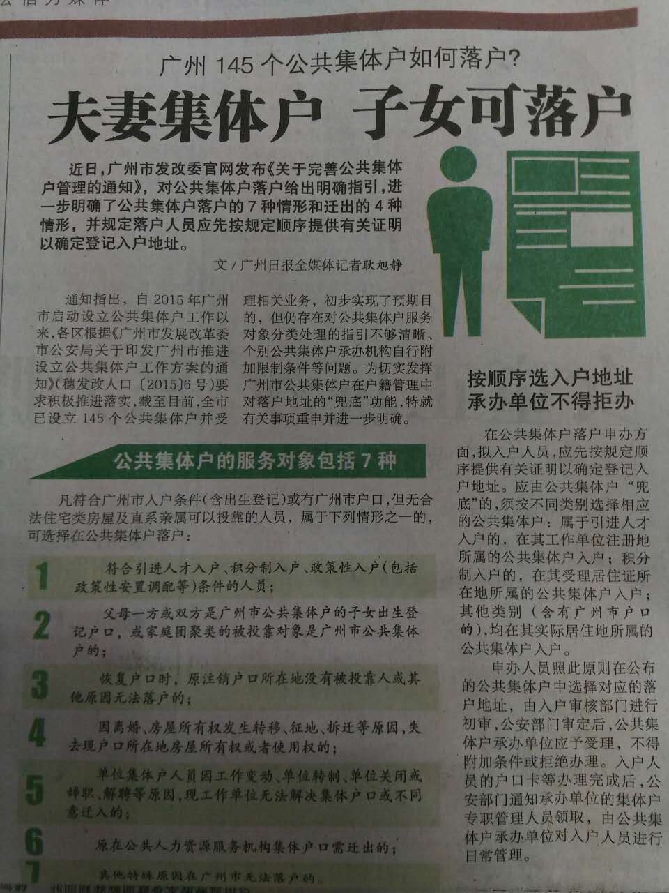 广州145个公共集体户如何落户? 夫妻集体户 子女可落户 GZdaily 20170615A15 ...